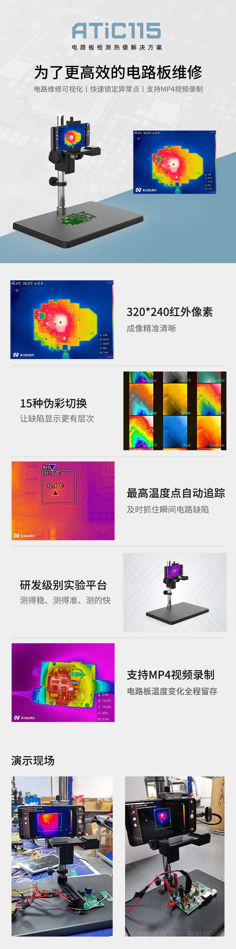 电路板上的芯片或其它功率器件的温度检测在研发、 维修等环节有重要意义。研发阶段,热像仪解决了使 用传统热电偶布点、数据收集整理效率低下不够直观 的问题,也给研发的后续设计改进提供了的信 息。维修阶段,热像仪直观快速的定位故障点,大大 降低维修操作的技能门槛,也节约了检测维修的 时间。