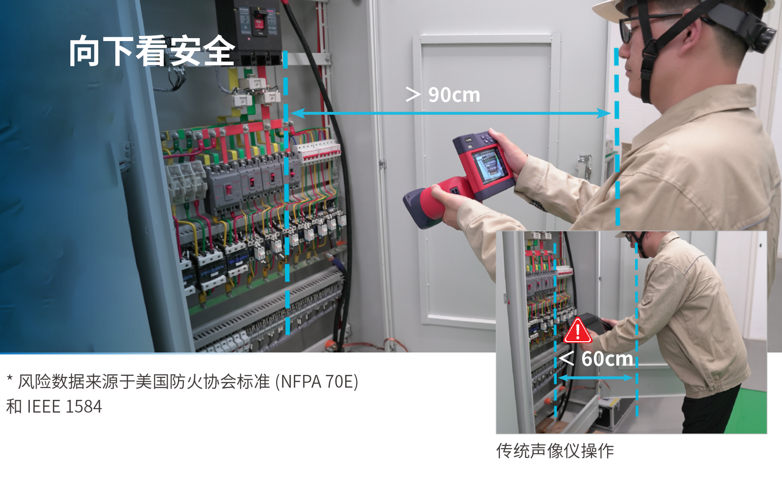 FOTRIC Flex 支持远距观察贴地部件,无需贴近带电区,有效降低电弧爆闪暴露等级,减少 PPE 穿戴负担。